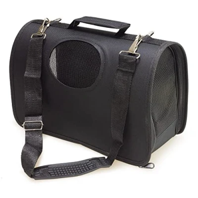 Semi-rigid bag with handle for carrying pets and removable shoulder strap. The entrance for the pet is located at the end by a zipper. Features ventilation vents for added comfort. Useful for small or medium pets such as puppies, cats or others. Dimensions: 43 x 24 x 26 cm