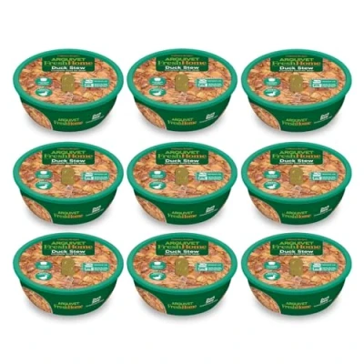 9-pack of Duck Stew. Complete wet dog food. Homemade recipe, slow-cooked just like at home, 100% natural and balanced. Ideal for dogs of all ages, including those with sensitive stomachs or food allergies. It can be served as a single meal or used as a delicious topping, adding extra flavor and aroma to dry food. With 97% fresh meat and locally sourced vegetables, selected to promote your dog's health and vitality. With the same ingredients used in human food! Fresh duck in its own sauce, sweet potato, peas, carrots, parsley, turmeric, tomato, and spices. Grain-free. Perfect for dogs with sensitive stomachs or allergies. Slow-cooked, preserving the nutrients, flavor, and natural texture they enjoy. High palatability and maximum digestibility. Promotes digestive health, immunity, and improved nutrient absorption. Convenient and refrigeration-free. No refrigeration or freezing required: always ready to serve. Truly natural, with no artificial preservatives, colors, or additives. Contains only ingredients you know and trust. Formulated by veterinarians and animal nutrition experts. Designed to meet all your dog's needs. Packaging features patented OpenVac technology. Vacuum-sealed without preservatives, prolonging its shelf life. Cooked at a low temperature, preserving the food's properties. The stew can be heated directly in the microwave in its original packaging to further enhance its flavor and aroma.