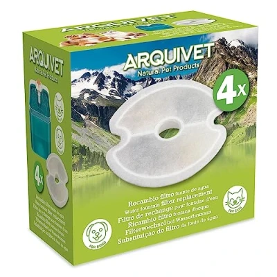 4 x replacement filters for the water source. Arquivet. Quadruple filter: high density cotton, coconut shell, activated carbon and ion exchange resin. Rinse the filter upwards before use to moisten the filter and clean the dust It is recommended to replace them regularly every 2 to 4 weeks to ensure the cleanest water source for your cats and dogs