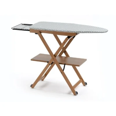 Massive beech structure Adjustable in 4 heights 84 - 88 - 91 - 93 cm working plan in galvanised net with perforations to let the steam pass through Wide foldway grid for steam iron support Wheel on the base acting in closed position Capacious shelf for laundry Exclusive cover made in cotton. Beautifully designed adjustable ironing board 110 x 45 cm shaped for comfortable ironing. Stable and robust frame in solid beech. Printed cotton ironing board cover coated with heat resistant aluminium which speeds up ironing by reflecting heat. Easy to store and move about, when folded the ironing board stays upright. Delivered already assembled. DIMENSIONS: OPEN: L135 x H84/88/91/93H x P45. CLOSED: H119 x 48 x P13 cm Original made in Italy,entirely made and product i by ARREDAMENTI ITALIA GROUP S.R.L.