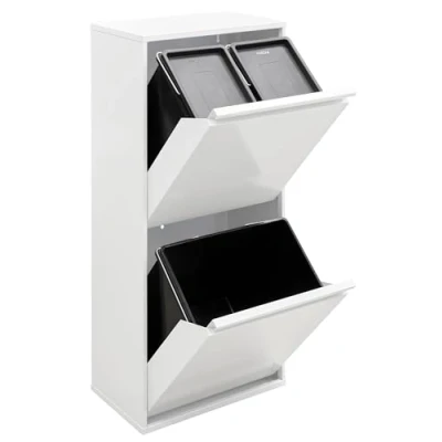 Recycling made easy: designed for convenient and easy waste separation. With independent compartments and tilt opening per bucket. The inner bins remain hidden inside the compartment, so bad odours are avoided. Special inner bins: included are 3 removable plastic buckets with handle. The 23L bucket is extra large and perfect for plastic waste or packaging. The 2 x 11 L buckets with lids are suitable for organic waste or odour-intensive waste. Combines with any decoration: thanks to its design, this waste separator fits in the kitchen, as well as in any other room of the home or office. Since it is only 24.5 cm deep, a lot of space is saved. Dimensions: 90.2 x 40.2 x 24.4 cm (H x W x D) For indoor use: robust and durable, made of steel. Suitable for indoor use. It is supplied in one piece, so assembly is not necessary. Set up or hang on the wall: this bin can be placed directly on the floor thanks to its great stability. It is also possible to hang it on the wall using the 3 rear holes (screws included).