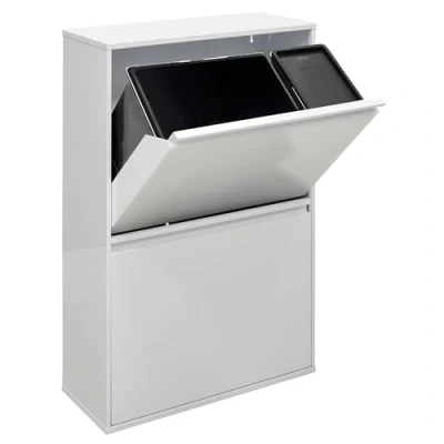 CONVENIENT AND EASY RECYCLING: Furniture designed to collect waste separately. Hidden trash cans inside each drawer to isolate odours Drawers open independently, with tilting opening. WITH REMOVABLE BUCKETS, A SPECIAL FOR PACKAGING: Includes 4 plastic buckets, with capacity of 23, 11, 17 and 17 litres. Special 23 litre bucket to have a larger capacity for containers. Buckets have handles for easy removal and cleaning. FOR ANY DECOR - Easily integrates into any kitchen, home or office decor. It does not protrude thanks to its narrow bottom. Dimensions: H 90.5 x W 58.5 x D 24.5 cm. INTERIOR: Robust and durable, made of steel. Suitable for indoor use. Supplied in one piece, no assembly required. STANDING ON THE FLOOR OR FIXED TO WALL: Can be placed leaning on the ground (has great stability) or hung on the wall. There are 3 holes on the back if you want to attach or hang (screws included).