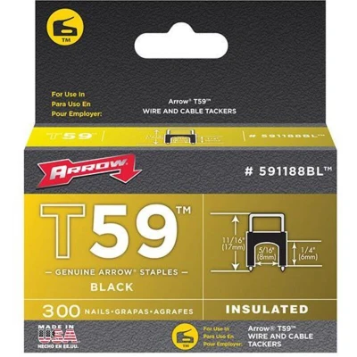 General description The Arrow T59 Insulated Staples are designed for efficient tacking of bell wire and other similar applications. These staples are available in black and are specifically made for use with the Arrow T59 staple gun. Technical specifications Size: 6 x 8 mm Colour: Black Quantity: Box of 300 Compatibility and accessories Compatible with Arrow T59 staple gun