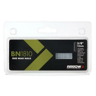 General description Arrow ABN1810 BN1810 Brad Nails are designed for use with Arrow staplers, providing reliable performance for various DIY and home improvement projects. This pack contains 1000 nails, each measuring 15mm in length, making them ideal for precise fastening tasks. Technical specifications Nail Gauge: 18 Nail Length: 5/8 in (15 mm) Pack Size: 1000 nails Compatibility and accessories Compatible with Arrow Staplers: T50 PBN, ETF50 PBN, ETF50 BN, ET100, ET25