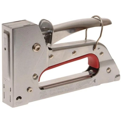 General description The Arrow JT27 Junior Staple Gun Tacker features an all-steel construction with a double chrome finish, making it a durable and reliable tool for light-duty tasks. It is designed for upholstery and general use, making it an excellent choice for occasional DIY users seeking a dependable and economical fine wire stapler. Technical specifications Construction: All steel with chrome finish Staple type: JT21 Staples Staple sizes: 6mm, 8mm, and 10mm Usage Ideal for general repairs, crafts, upholstery, and decorating Features a staple exit indicator for precision accuracy Convenient bottom load magazine with pinch release for easy reloading and jam clearing Staple viewing window to indicate when staples are running low Handle lock secures the handle against the tool frame for safe storage Other information Comes with a 90-day limited warranty
