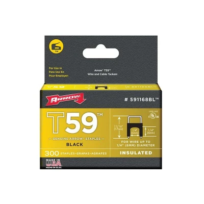 General description The Arrow T59 Insulated Staples are designed for efficient tacking of bell wire and similar applications. These staples are available in black and are specifically made for use with the Arrow T59 staple gun. Technical specifications Size: 6 x 6mm Colour: Black Quantity: Box of 300 Compatibility and accessories Compatible with Arrow T59 staple gun