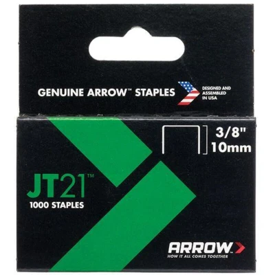General description Arrow JT21 T27 Staples are designed for light-duty applications and are compatible with the JT21 and JT21C staple guns. These staples are ideal for various projects, providing reliable performance and ease of use. Technical specifications Size: 3/8 in (10 mm) Quantity: Box of 5000 staples (5 x 1000)