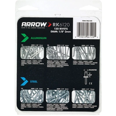 General description The Arrow RK6120 Rivet Pack includes an assortment of sizes and types of rivets, designed for safe, solid, and secure joining of metal parts. This pack of 120 rivets is capable of bonding materials that staples and glue cannot effectively join. Technical specifications Contents: 120 rivets total 25 - 1/8in Short Aluminium Rivets 20 - 1/8in Medium Aluminium Rivets 15 - 1/8in Long Aluminium Rivets 25 - 1/8in Short Steel Rivets 20 - 1/8in Medium Steel Rivets 15 - 1/8in Long Steel Rivets Reusable plastic container