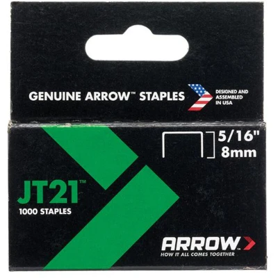 General description Arrow A215 JT21 T27 Staples are designed for light-duty applications and are compatible with the JT21 and 21C staple guns. Each box contains 1000 staples, making them ideal for various DIY and home improvement projects. Technical specifications Size: 8mm (5/16in) Pack quantity: 1000 staples