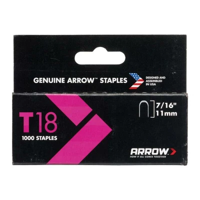 General description Arrow A187 T18 Staples are designed for use with T18 wiring tackers. These staples feature a round crown and a divergent pointed design, ensuring secure fastening for various applications. Technical specifications Size: 11mm (7/16in) Crown: 5mm (3/16in) Pack of 1,000 staples Material: Steel