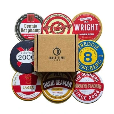 BUNDLE OF 8 - A must-have for any Arsenal fan! Get 8 Arsenal beer mats - perfect for displaying your support for the team at any party or gathering. Show your allegiance with the Gunners with these AFC themed beer mats. PERFECT PRESENT - Surprise your favourite Arsenal fan with these Beer Mat Coasters! A unique and thoughtful Arsenal gift they'll love. Making a great stocking filler. GIFT PACKAGED – Arriving in a premium gift box ensuring your beer mats come in perfect condition, hassle-free. PREMIUM PULPBOARD - This beer mat set is made of a durable, high-quality, thick, absorbent pulpboard that'll make any footy fan proud. Perfect for keeping your drinks and tables safe. UNIQUE DESIGNS - Indulge in a relaxed and nostalgic vibe as you enjoy your favourite drink, surrounded by the iconic players, club songs, and historic moments that define the team's legacy.