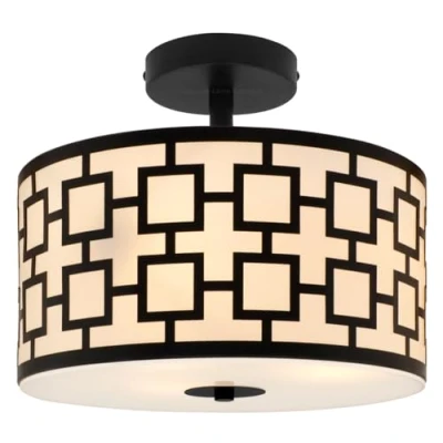 Semi flush mounted ceiling light fitting fixed rod designed for lower ceilings Beautiful chequered black and white design finished onto solid plastic lamp shade The bottom of the lamp shade is glass which adds to the charm and diffuses the light for an ambient glow Requires 3 x E27/ES bulbs max 60w, not included, LED Compatible Ideal ceiling lamp fitting designed for lower ceilings where pendant lights won't hang