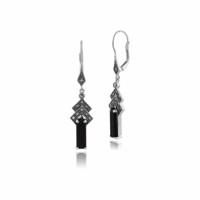 Art Deco Style Rectangle Black Onyx & Marcasite Drop Earrings in Silver