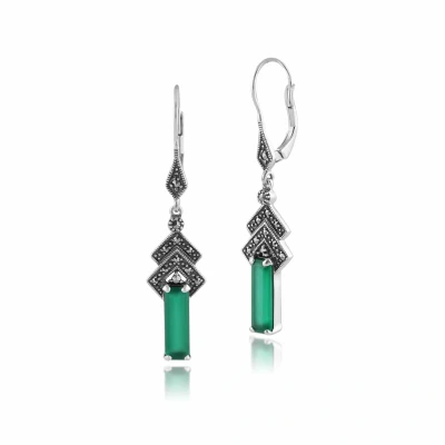 Art Deco Style Rectangle Green Chalcedony & Marcasite Drop Earrings in Silver