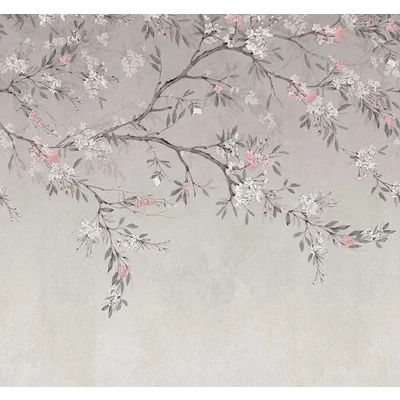 A painterly digital mural design with a drift of blossom branches. Shown here in the soft grey colourway.