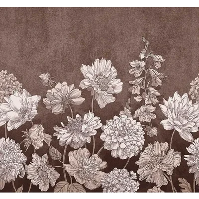Large scale delicate etching style drawing of flower stems set against a faded ombré colour background. Shown here in the chocolate brown colourway. Search: dahlia, poppy, chrysanthemum