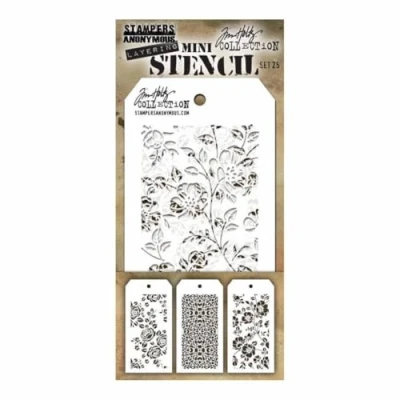 Tim Holtz Mini Layering Stencil Set #25 MTS025 These mini stencils feature the same designs as Tims standard Layering Stencils, but they are a scaled down version of the originals. They are perfect for layering inks, paints, and stains onto portions of your project, while allowing more of the design to show. Use them as a set or separately for so many creative possibilities. This set includes the following mini stencils: Roses, Ornate, and Floral. Tag-shaped mini stencils measure approximately 3 1/8" x 6 1/4", with a convenient hole in top to attach with a Cable Binder Ring (sold separately). MST025 AGMST025 AGMST025 MPN MST025