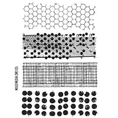 Tim Holtz Cling Mount Stamps: Mixed Media. Three deeply etched red rubber cling mount rubber stamps that adhere to any clear acrylic block. We highly recommend using them with Tim Holtz Grid-Blocks. Honeycomb measures approximately 5 1/4" x 2", dots measure approximately 5 1/2" x 1 7/8". Stamps come on a 3-hole punched sheet for easy storage. MPN CMS125