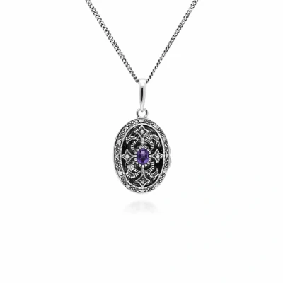 Art Nouveau Style Oval Amethyst & Marcasite Locket Necklace in 925 Sterling Silver
