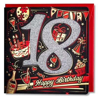 Original, unique 18th birthday card, handmade in an art factory Birthday card made of black matte paper, decorated with gold-plated print and shiny silver glitter Inside the coloured card there is a white insert on which you can write your own wishes The card comes with a red envelope to give it an even more festive character The square birthday card measures 150 x 150 mm and the envelope 156 x 156 mm