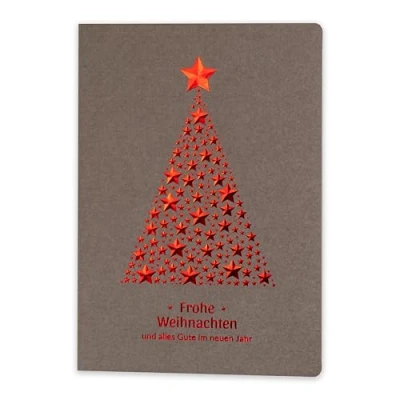 The set consists of: 10 cards, manufacturing production - embossing and hot foil printing on exclusive colourful recycled paper as well as white inserts for self-writing or printing and envelopes. Colours, papers, dimensions: jewellery box 250-270 g/m². Cards in a colour of the same pattern. Dimensions 240 x 170 mm (120 x 170 mm folded); inserts - offset paper white 120 g/m²; dimensions 230 x 160 mm (115 x 160 mm folded); envelopes - white paper 100 g/m²; dimensions 125 x 175 mm. All types of paper meet the FSC standards of the responsible economy with wood resources. For the production of the cards, we use eco-paper, which is 70% recycled. Text of wishes: the cards are delivered blank, without desired text. Any requests can be written or printed on included inserts. The inserts are white and can be printed with laser or ink printers that have paper setting (dimensions 230 x 160 mm). For business – there is the possibility to place company logo on the front of the Christmas cards and have wishes printed on the insert – more information is available on our artnuvo.de INFO BZGL. Colours: depending on the monitor used and its settings, the colour of the invitations may vary slightly from the original.