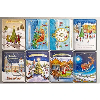 The set consists of 16 Christmas cards, printed on white card with colourful decorative lettering on the front. The set contains 8 card patterns, each 2 pieces of each pattern. Colours, papers, dimensions: the cards are made from thick 350 gsm cardboard with the dimensions 105 x 148 mm. On the back there is plenty of space for the address and personal wishes. All papers used by our publisher comply with FSC standards - the rationel-le management of forest resources. Text of wishes: the cards are delivered blank, the space for your wishes is located on the back. The cards are made from a cardboard coated on one side, which allows you to write on them with a ballpoint pen - just like a conventional postcard. INFO BZGL. Colours: depending on the monitor used and its settings, the colour of the invitations may vary slightly from the original.