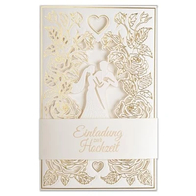 art nuvo ZAP_DE_09 Wedding Invitations Pack of 20 130 x 205 mm with Printable Inserts and Envelopes for Weddings, Laser Cut, Gold Foil Finished. Pressed Pattern Engraved Letters