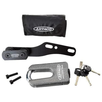 bunker selection motorbike anti-theft device with the most exclusive top-of-the-range locks, quality in all respects: integration, functionality and resistance number 1 in the comparative tests. the most universal and versatile dimensions, as well as being used to lock the brake disc, you can combine it with the top level artago 14 chains. disc-tech art+ technology, the most advanced and secure anti-picking lock with 5mm anti-drill disc, key duplication by code, very useful in case of loss. double anti-corrosion treatment, inside and outside, made in europe by artago secure, the specialist in high-end anti-theft motorbike locks. ; Included components: Padlock, stand and keys