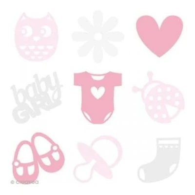 Assortment of 45 small felt shapes with baby girl theme, in pink and white You can use it as a wallet and decoration, using a simple glue dot. You will find in this set 9 different models, in 5 copies each They will be ideal for making birth-related creations.