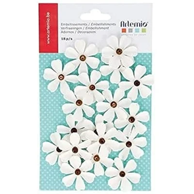 18 x Wooden flowers in white paper with a pearl at their centre Perfect for a the fantasy and the authenticity to your scrapbooking projects Material: Paper