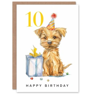 Artery8 10th Birthday Card Cute Terrier Dog Puppy Party Hat Kids Age 10 Year Old Child For Son Daughter Girl Boy Happy