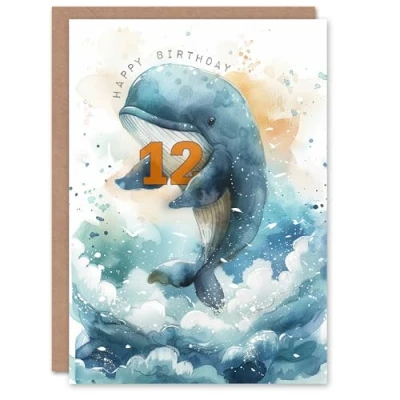 Artery8 12th Birthday Card Cute Whale Wave Jump Illustration Kids Age 12 Year Old Child For Son Daughter Girl Boy Happy