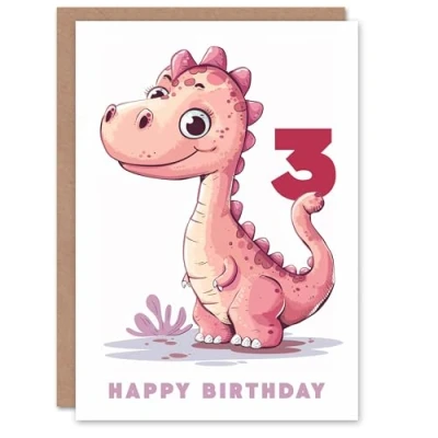 Artery8 3rd Birthday Card Cute Pink Baby Dinosaur Cartoon Kids Age 3 Year Old Child For Son Daughter Girl Boy Happy