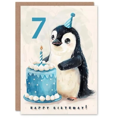Artery8 7th Birthday Card Cute Baby Penguin Cake Cartoon Kids Age 7 Year Old Child For Son Daughter Girl Boy Happy