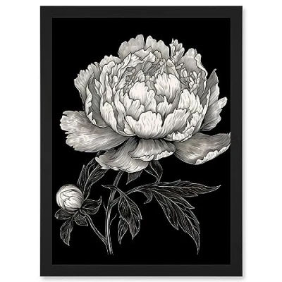 Artery8 A Peony Flower Bloom Black and White Blind Contour Artwork Framed A3 Wall Art Print