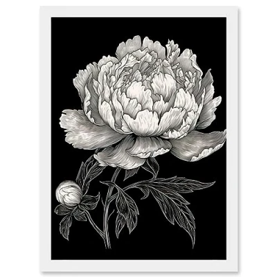 Artery8 A Peony Flower Bloom Black and White Blind Contour Artwork Framed Wall Art Print A4