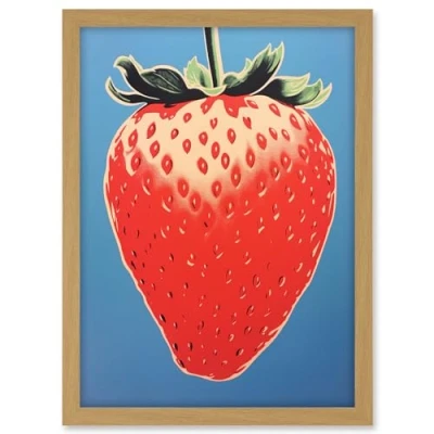 Artery8 A Single Strawberry Block Colour Artwork Red on Blue Bold Bright Minimalist Kitchen Decor Framed A3 Wall Art Print