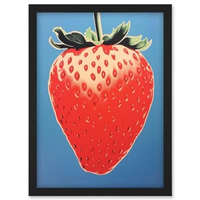 Artery8 A Single Strawberry Block Colour Artwork Red on Blue Bold Bright Minimalist Kitchen Decor Framed Wall Art Print A4