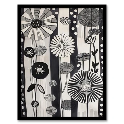 Artery8 Abstract Black White Wildflowers Stripes Artwork Living Room Framed Wall Art Print A4