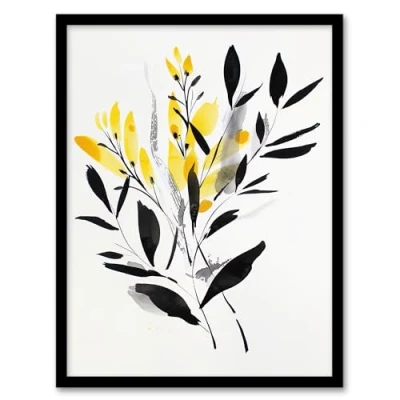 Artery8 Abstract Botanical Yellow Black Leaves Fronds Living Room Artwork Framed Wall Art Print A4