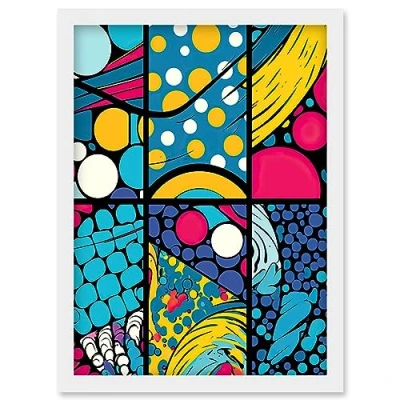 Artery8 Abstract Bubbles and Geometric Patterns Comic Book Style Red Blue Yellow White Pop Art Halftone Artwork Framed Wall Print A4