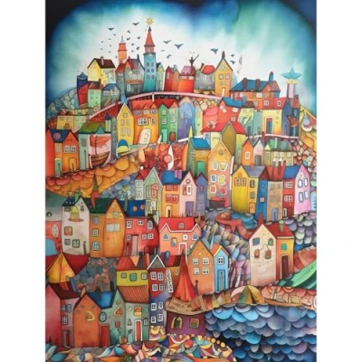 Artery8 Abstract Fishing Village Folk Art Extra Large XL Wall Poster Print