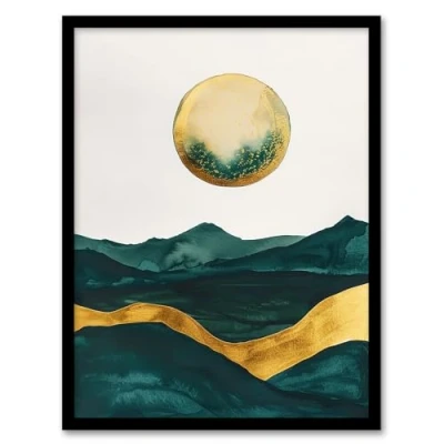 Artery8 Abstract Full Moon Seascape Dark Green Gold Boho Living Room Artwork Framed Wall Art Print A4
