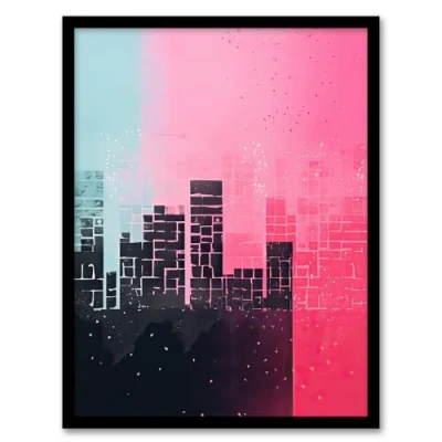 Artery8 Abstract Geometric Cityscape Painting Aqua Blue Pink Pastel Colour Artwork Framed Wall Art Print A4