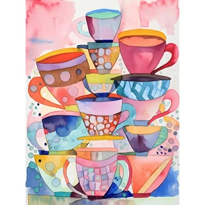 Artery8 Abstract Kitchen Cups And Saucers Folk Art Extra Large XL Wall Poster Print