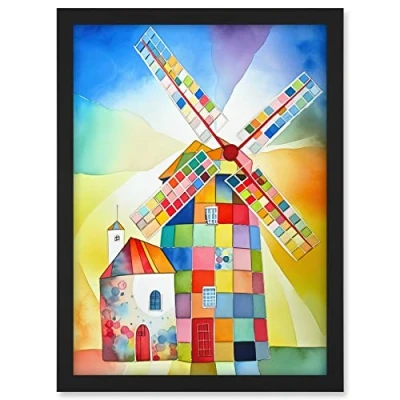 Artery8 Abstract Patchwork Windmill Old Amsterdam Folk Art Artwork Framed A3 Wall Print