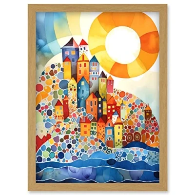 Artery8 Abstract Seascape Sunrise Village Folk Art Artwork Framed Wall Print A4