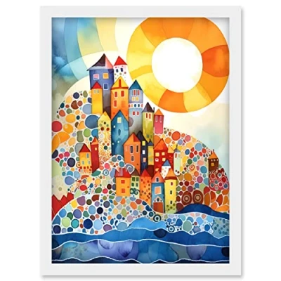 Artery8 Abstract Seascape Sunrise Village Folk Art Artwork Framed Wall Print A4