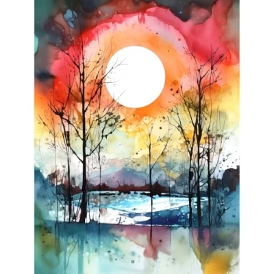 Artery8 Abstract Sunset Landscape Watercolour Painting Countryside Lake Autumn Trees Large Wall Art Poster Print Thick Paper 18X24 Inch