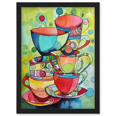 Artery8 Abstract Tea Cups Folk Art Kitchen Artwork Framed Wall Print A4